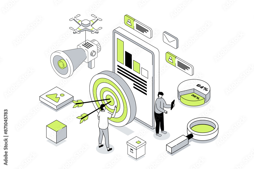 Wall mural target audience 3d isometric concept in outline isometry design for web. people study market data an - Wall murals Wall mural target audience 3d isometric concept in outline isometry design for web. people study market data an - Wall murals