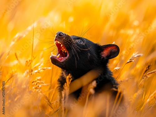The watermark will not be included on Wall mural.: Tasmanian devil growls in golden meadow displaying wildlife conservation and predator behavior -