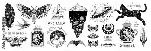 Wall mural tattoo art. vector surreal astrology. universe space tattoo print. magic witch astronomy graphic wit