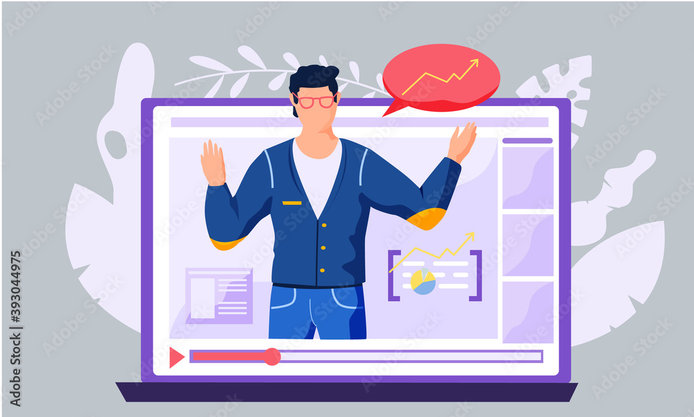 Wall mural : Teacher in glasses on the computer screen explains new topic - e-learning webinar presentation concep