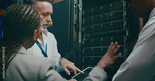 Wall mural team, tablet programming and server room for planning, digital screen coding or cloud computing solu - Wall murals Wall mural team, tablet programming and server room for planning, digital screen coding or cloud computing solu - Wall murals