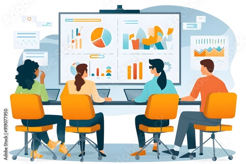 The watermark will not be included on Wall mural.: Team collaboration in data analysis meeting with visual graphs and charts