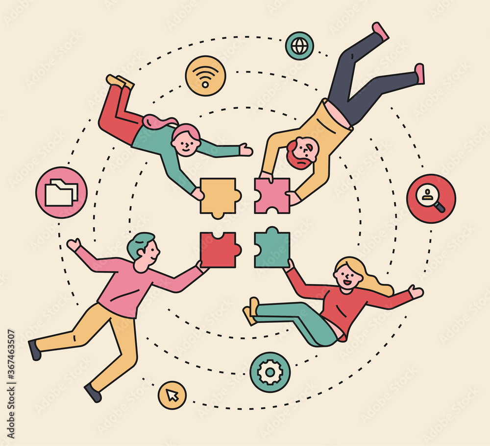 The watermark will not be included on Wall mural.: Team members of the office are holding each piece of the puzzle and turning round and round to match