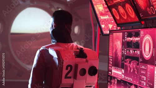 The watermark will not be included on Wall mural.: Team of astronauts in a space suits aboard the mars station - a crew of cosmonauts piloting the space
