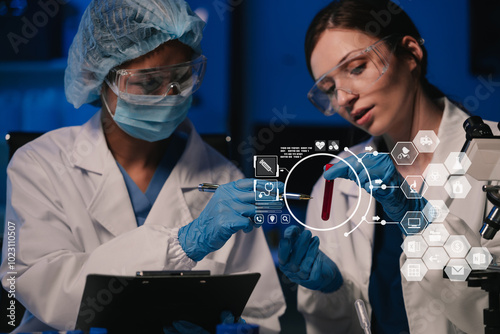 The watermark will not be included on Wall mural.: Team of biochemical research scientists working with a microscope for vaccine development