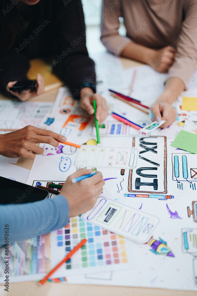 The watermark will not be included on Wall mural.: Team of creative web, graphic designer planning for mobile phone, drawing website ux ui app for mobi