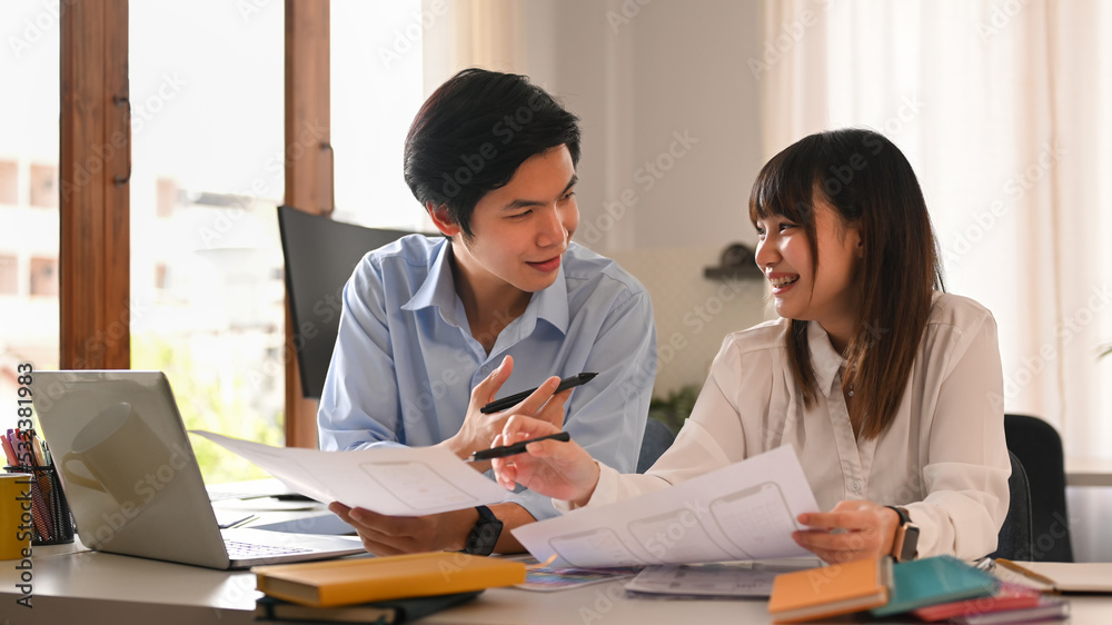 Wall mural : Team of creative web designers discussing and developing template layout for mobile application in c