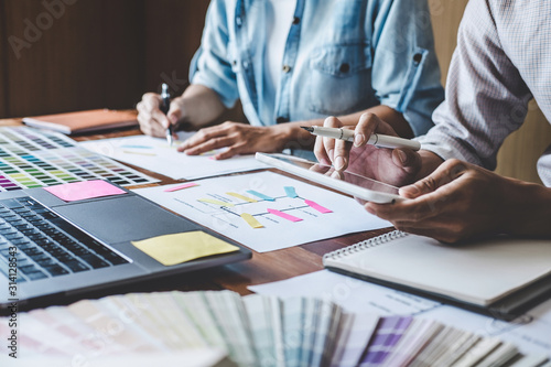 Team of creative web/graphic designer planning, drawing website ux app for mobile phone application Wall mural
