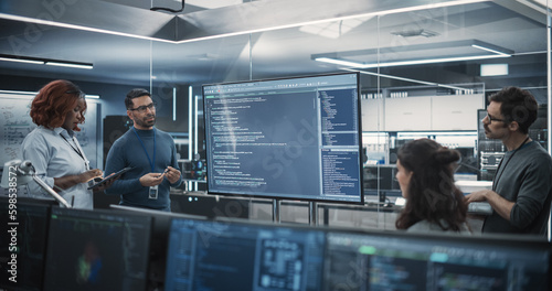 The watermark will not be included on Wall mural.: Team of diverse software developers having a meeting in order to review the code done by computer en