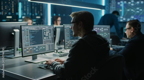 The watermark will not be included on Wall mural.: Team of it programers working on desktop computers in data center control room - young professionals