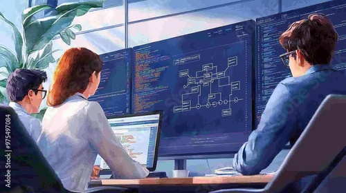 Wall mural : Team of software developers collaborating in a modern tech office, with large screens showing data f