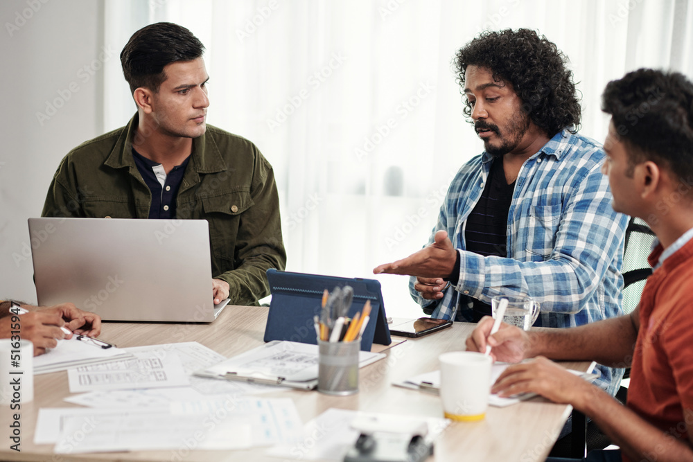 The watermark will not be included on Wall mural.: Team of software developers meeting at round table to discuss project progress