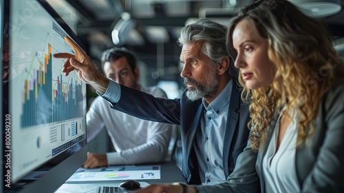 The watermark will not be included on Wall mural.: Team of three white software engineers collaborating in office working together writing code at comp