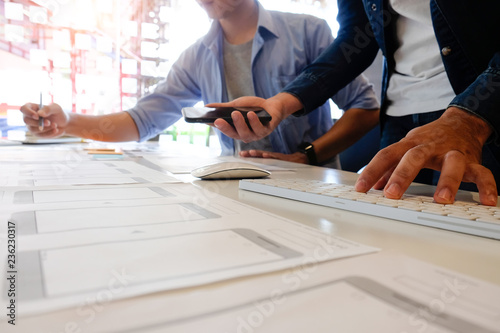 The watermark will not be included on Wall mural.: Team software development working with pre-project design application on mobile with paper -