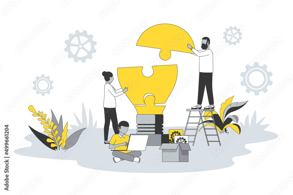 The watermark will not be included on Wall mural.: Teamwork and brainstorming concept in flat line design - people generating new ideas, brainstorming,