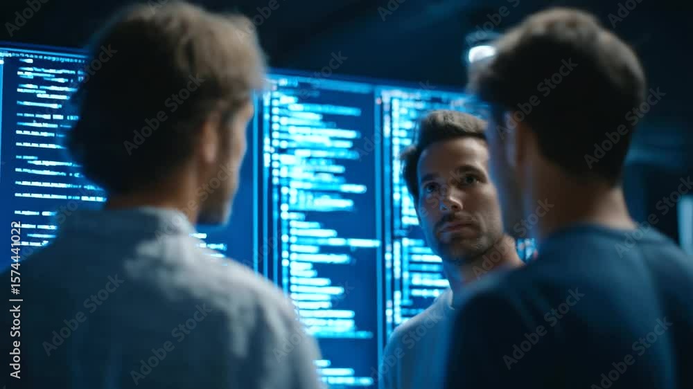 Wall mural : Tech startup team collaborates on ai chatbot innovation in modern office setting -