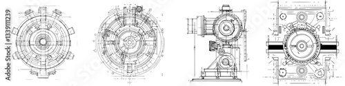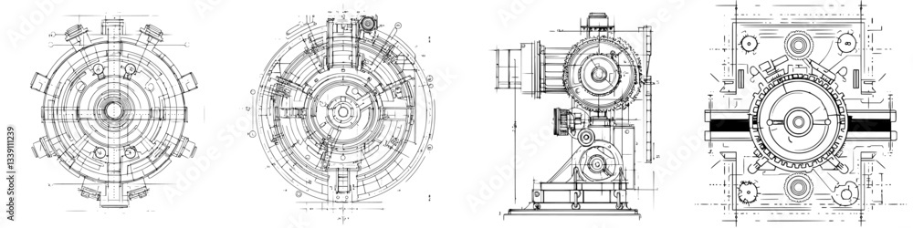 The watermark will not be included on Wall mural.: Technical drawings of a mechanical device showcasing intricate designs and engineering details in a