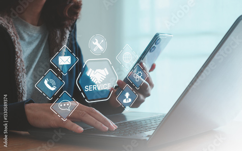 The watermark will not be included on Wall mural.: Technical support operator working on laptop computer with virtual screen - helpdesk it support call