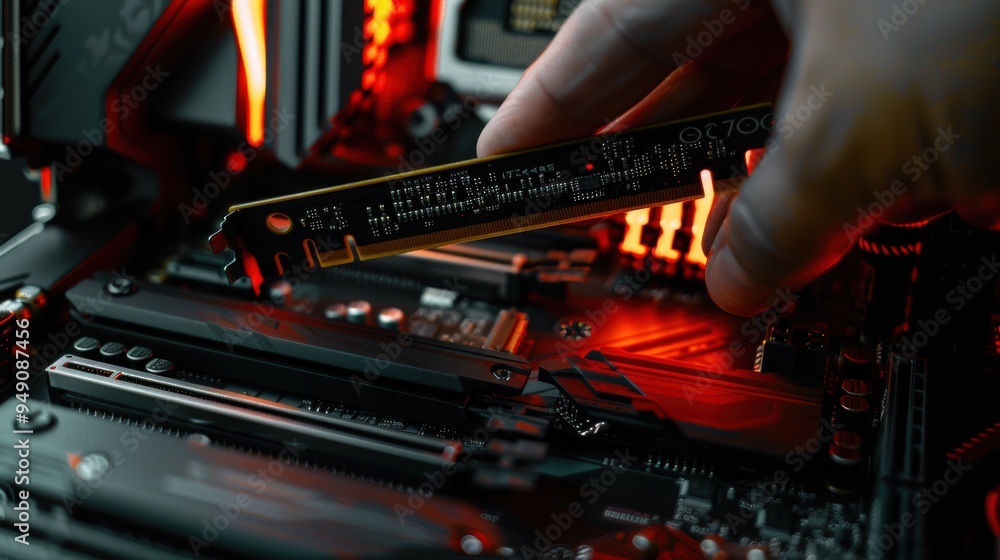 The watermark will not be included on Wall mural.: Technician installing ram memory module into gaming motherboard