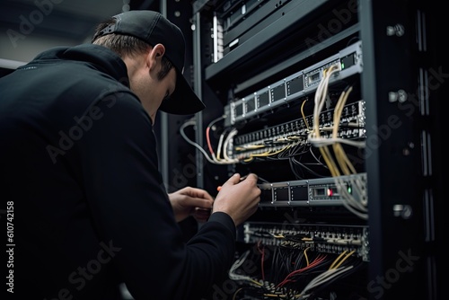 The watermark will not be included on Wall mural.: Technician repairing server in data center - technology and internet concept - an it engineer close up