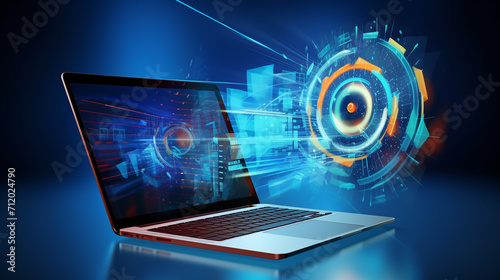 Wall mural techno background with abstract digital target with an arrow on a laptop screen