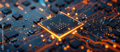 Wall mural technological marvel: close-up of an advanced ai chip with intricate circuitry and components - Wall murals Wall mural technological marvel: close-up of an advanced ai chip with intricate circuitry and components - Wall murals