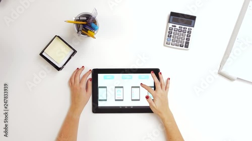 Wall mural : Technology, interface design and people concept - hands of creative woman or developer with ui templ