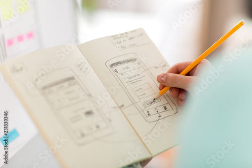 Wall mural : Technology, user interface design and people concept - hand of ui designer or developer drawing smar