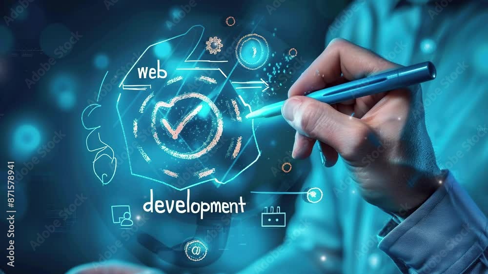 Wall mural technology background. businessman checks a mark on a virtual screen with the text "web development" - Wall murals Wall mural technology background. businessman checks a mark on a virtual screen with the text "web development" - Wall murals