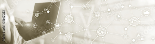 Wall mural : Technology background - workflow organisation structure on virtual screen - laptop -