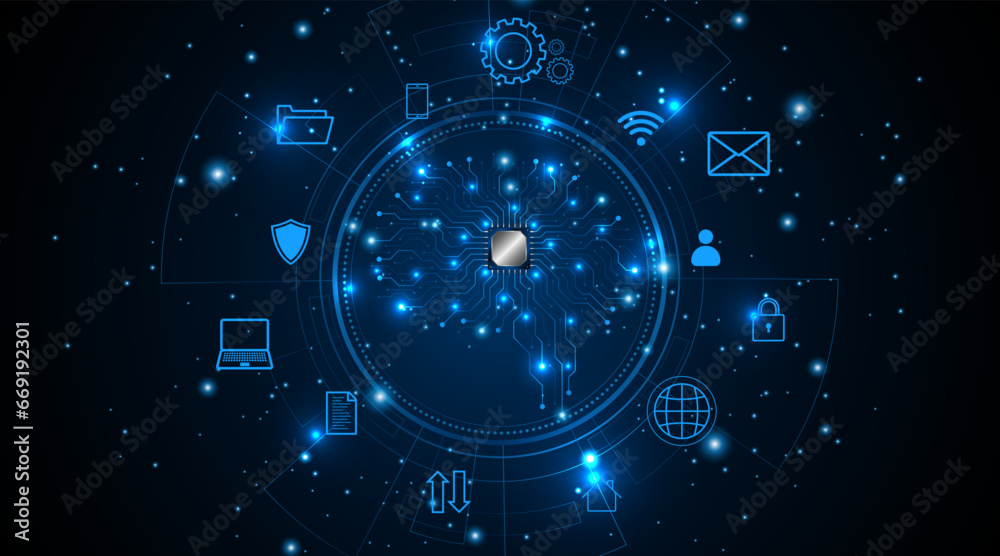 Wall mural technology brain circuit board with microchip processor on dark blue background. data processing con - Wall murals Wall mural technology brain circuit board with microchip processor on dark blue background. data processing con - Wall murals