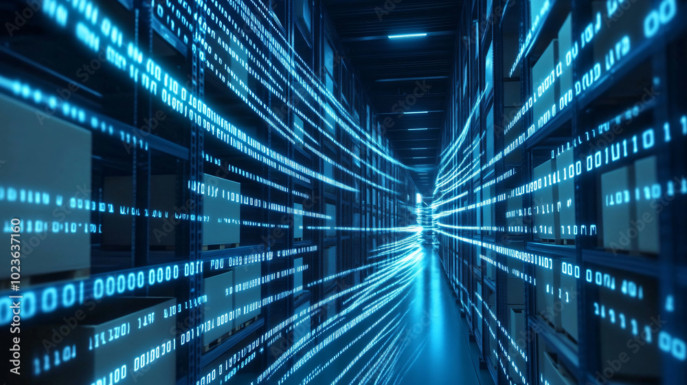 Wall mural technology concept of a warehouse with optimized storage shelving with cardboard box organization, w - Wall murals Wall mural technology concept of a warehouse with optimized storage shelving with cardboard box organization, w - Wall murals