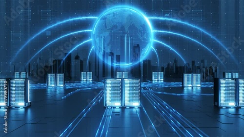 Wall mural technology earth data flow, global internet information processing. future high-tech server cluster,