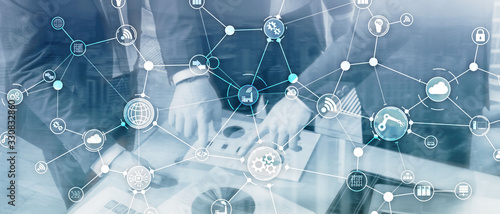 Wall mural technology industrial business process workflow organisation structure on virtual screen. iot smart
