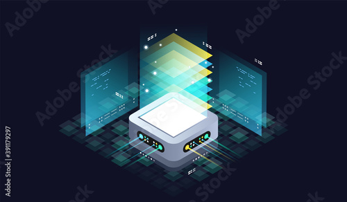 Wall mural technology isometric infographic design for quantum computer. blockchain server concept, server room