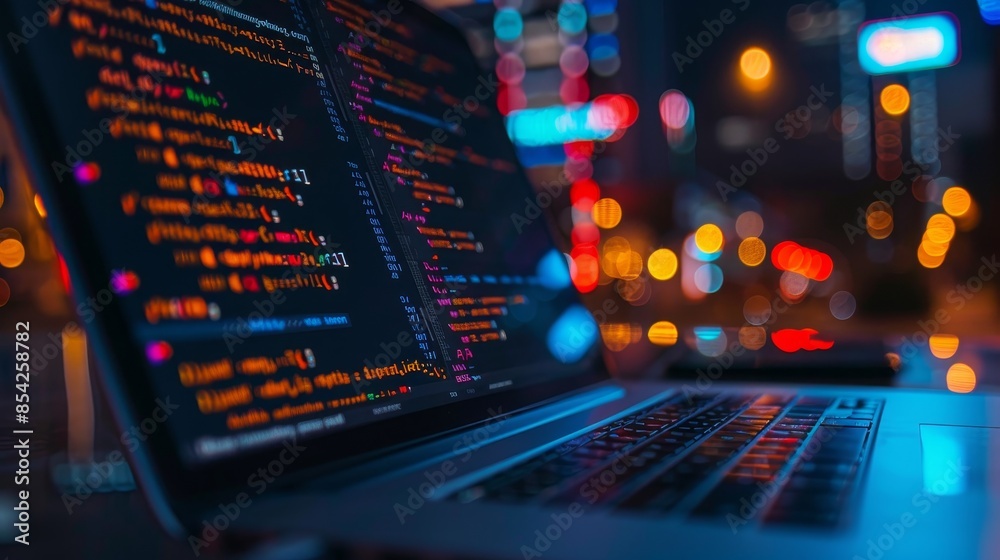 Wall mural technology of software development, web design, programming concept. program code on screen laptop,  - Wall murals Wall mural technology of software development, web design, programming concept. program code on screen laptop, - Wall murals
