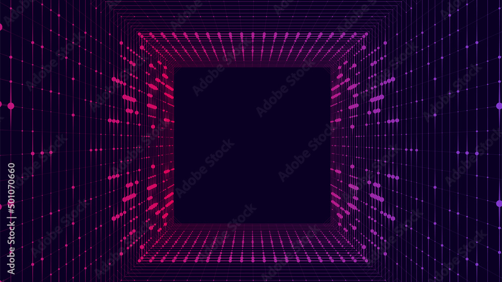 Wall mural technology wireframe square tunnel on dark background. futuristic 3d wormhole grid. digital dynamic
