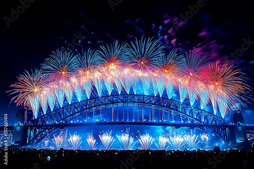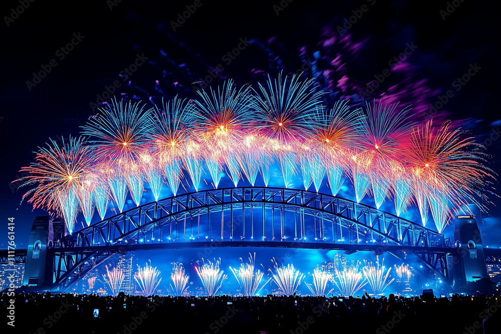 The watermark will not be included on Wall mural.: Telephoto shot capturing a sequence of fireworks exploding over the bridge