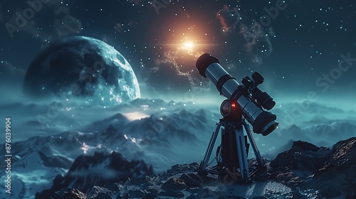 The watermark will not be included on Wall mural.: Telescope on mountain top with giant moon and clouds in background ai generated