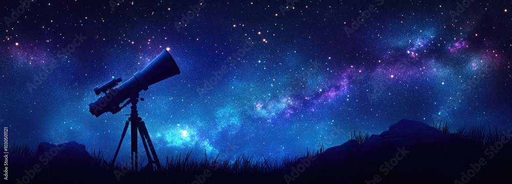 Wall mural telescope on the background of sky with stars and galaxies at night. - Wall murals Wall mural telescope on the background of sky with stars and galaxies at night. - Wall murals