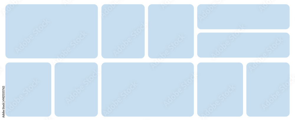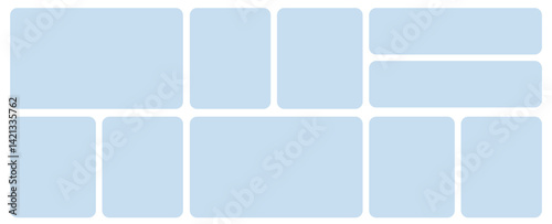 Wall mural template of photo montage. 10 blue frames design composition for gallery for website with squares. b