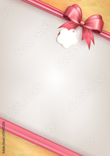 Template of vertical banner with pink bow ribbon and paper label tag in the corner as frame and copyWall mural