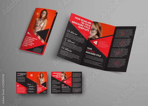 The watermark will not be included on Wall mural.: Template vector black tri-fold brochure with triangular elements and place for photo -