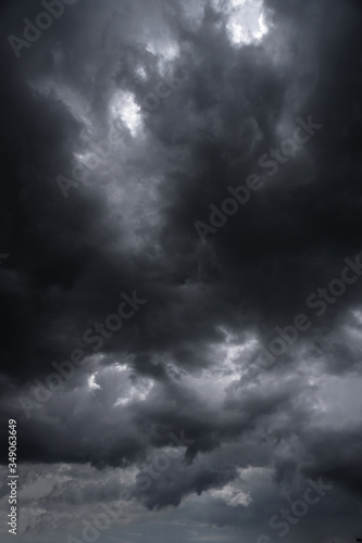 The watermark will not be included on Wall mural.: Terrible thunderclouds from the side of a plane - gloomy epic clouds - background image in a dark gray