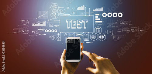 Wall mural : Test theme with hand pressing a button on a technology screen