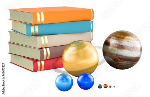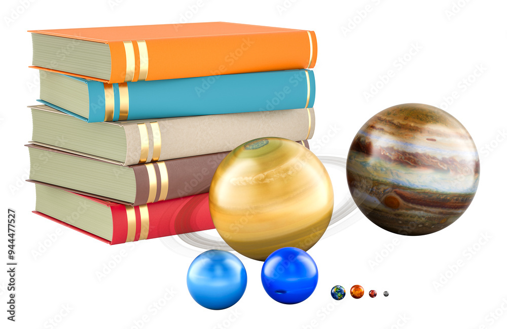 The watermark will not be included on Wall mural.: Textbooks with planets of solar system and satellites - 3d rendering isolated on transparent backgrou