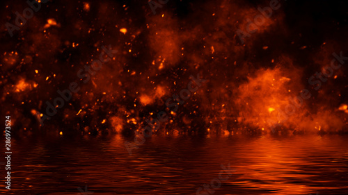 Wall mural texture of fire with reflection in water. flames on isolated black background. design element.