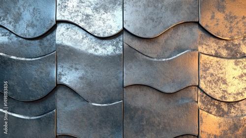 The watermark will not be included on Wall mural.: Textured metallic panels with wavy patterns and light reflection