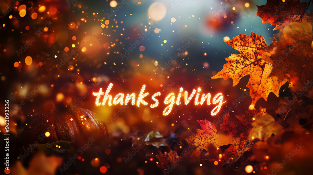 The watermark will not be included on Wall mural.: Thanksgiving celebration with glowing text surrounded by autumn leaves and bokeh lights - fall holida