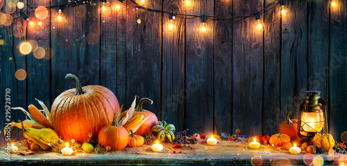 Thanksgiving - pumpkins on rustic table with candles and string lightsWall mural
